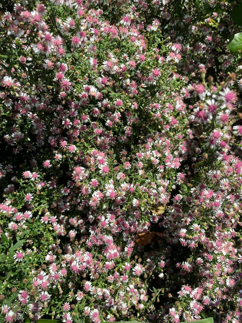 - Aster lat Horizontalis, roze witte bloemetjes helemaal vol, 8-10, 50-80, groeit eerst smal daarna steeds breder, heeft dus wat ruimte nodig, zon/halfschaduw, vlinders, snijbloem